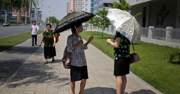 Women walking under parasols talk on the sidewalk on Mirae Scientist Street in Pyongyang, North Korea, Monday, June 18, 2018. (AP Photo/Dita Alangkara)